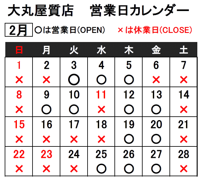 【 2026年2月の休業日(予定)について 】 2月1・2・6・7・8・11・14・15・16・17・18・21・22・23・24・28日 休業